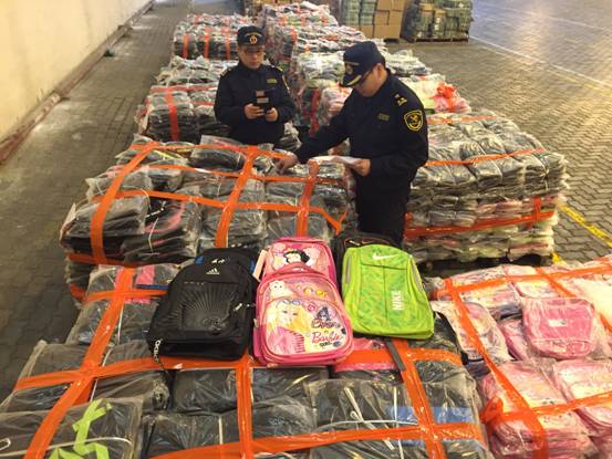 Customs officers were inspecting the infringing knapsacks.